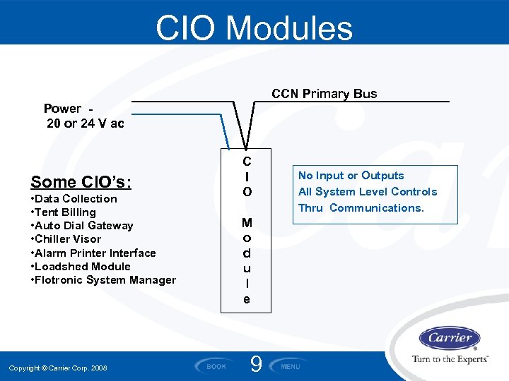 CIO ’s Communications Input / Output • For System Level Control Strategies – Chiller Plant Control – VAV Air Systems Control – Loadshed – Watersource Heatpump Systems Copyright © Carrier Corp. 2008 8