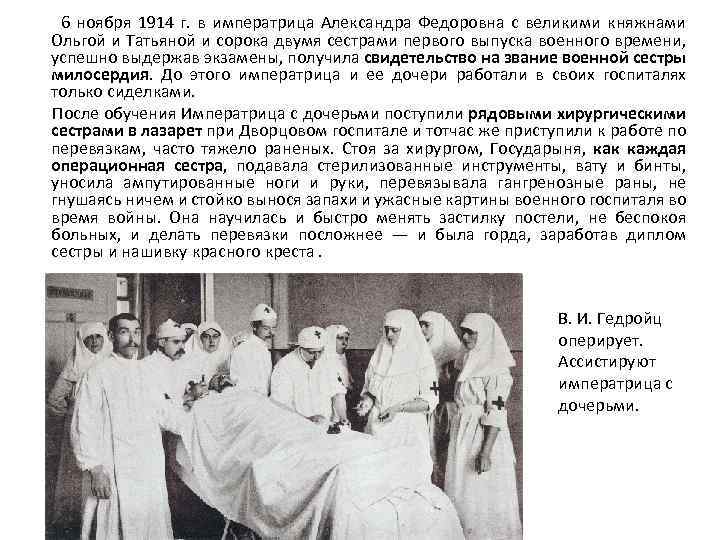 6 ноября 1914 г. в императрица Александра Федоровна с великими княжнами Ольгой и Татьяной и сорока двумя сестрами первого выпуска военного времени, успешно выдержав экзамены, получила свидетельство на звание военной сестры милосердия. До этого императрица и ее дочери работали в своих госпиталях только сиделками. После обучения Императрица с дочерьми поступили рядовыми хирургическими сестрами в лазарет при Дворцовом госпитале и тотчас же приступили к работе по перевязкам, часто тяжело раненых. Стоя за хирургом, Государыня, как каждая операционная сестра, подавала стерилизованные инструменты, вату и бинты, уносила ампутированные ноги и руки, перевязывала гангренозные раны, не гнушаясь ничем и стойко вынося запахи и ужасные картины военного госпиталя во время войны. Она научилась и быстро менять застилку постели, не беспокоя больных, и делать перевязки посложнее — и была горда, заработав диплом сестры и нашивку красного креста. В. И. Гедройц оперирует. Ассистируют императрица с дочерьми.