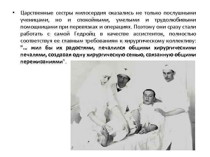 • Царственные сестры милосердия оказались не только послушными ученицами, но и спокойными, умелыми и трудолюбивыми помощницами при перевязках и операциях. Поэтому они сразу стали работать с самой Гедройц в качестве ассистенток, полностью соответствуя ее главным требованиям к хирургическому коллективу: "… жил бы их радостями, печалился общими хирургическими печалями, создавая одну хирургическую семью, связанную общими переживаниями".