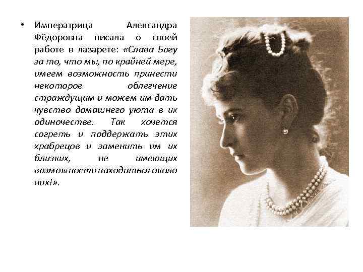 • Императрица Александра Фёдоровна писала о своей работе в лазарете: «Слава Богу за то, что мы, по крайней мере, имеем возможность принести некоторое облегчение страждущим и можем им дать чувство домашнего уюта в их одиночестве. Так хочется согреть и поддержать этих храбрецов и заменить им их близких, не имеющих возможности находиться около них!» .