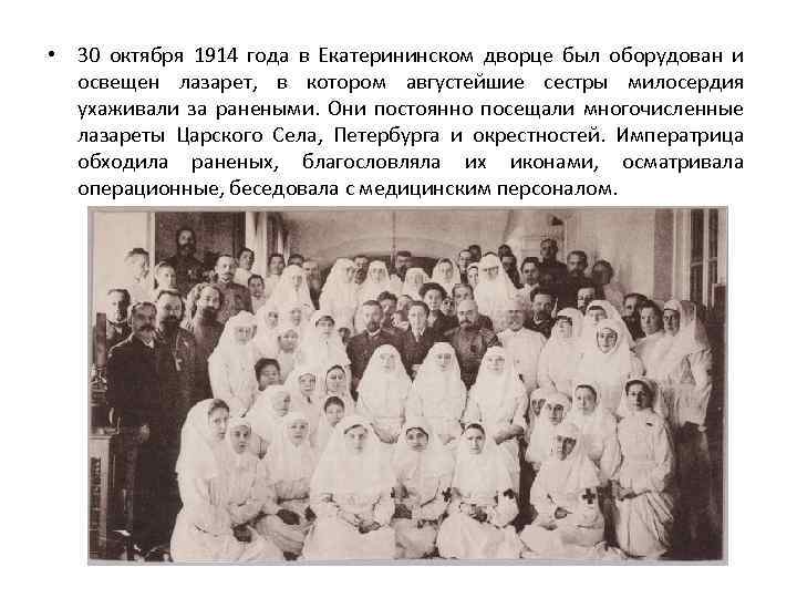 • 30 октября 1914 года в Екатерининском дворце был оборудован и освещен лазарет, в котором августейшие сестры милосердия ухаживали за ранеными. Они постоянно посещали многочисленные лазареты Царского Села, Петербурга и окрестностей. Императрица обходила раненых, благословляла их иконами, осматривала операционные, беседовала с медицинским персоналом.
