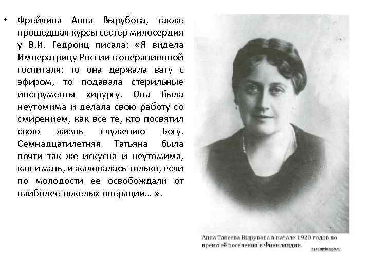 • Фрейлина Анна Вырубова, также прошедшая курсы сестер милосердия у В. И. Гедройц писала: «Я видела Императрицу России в операционной госпиталя: то она держала вату с эфиром, то подавала стерильные инструменты хирургу. Она была неутомима и делала свою работу со смирением, как все те, кто посвятил свою жизнь служению Богу. Семнадцатилетняя Татьяна была почти так же искусна и неутомима, как и мать, и жаловалась только, если по молодости ее освобождали от наиболее тяжелых операций… » .