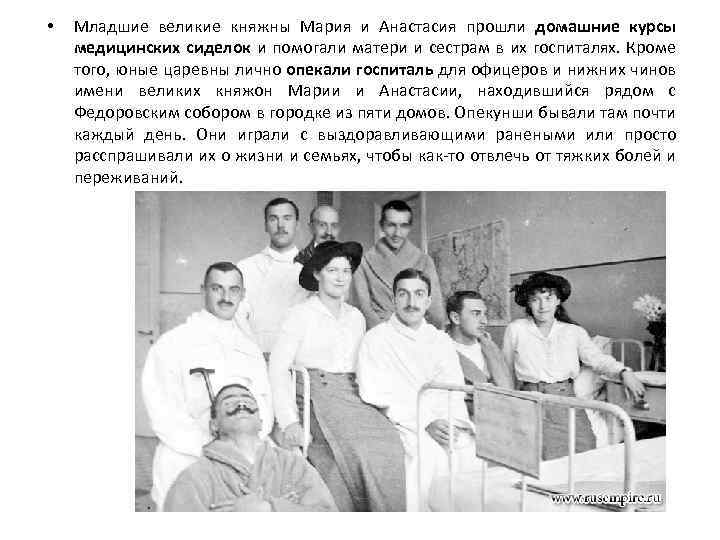 • Младшие великие княжны Мария и Анастасия прошли домашние курсы медицинских сиделок и помогали матери и сестрам в их госпиталях. Кроме того, юные царевны лично опекали госпиталь для офицеров и нижних чинов имени великих княжон Марии и Анастасии, находившийся рядом с Федоровским собором в городке из пяти домов. Опекунши бывали там почти каждый день. Они играли с выздоравливающими ранеными или просто расспрашивали их о жизни и семьях, чтобы как-то отвлечь от тяжких болей и переживаний.