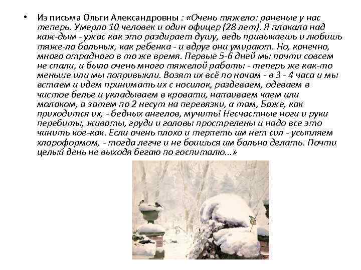 • Из письма Ольги Александровны : «Очень тяжело: раненые у нас теперь. Умерло 10 человек и один офицер (28 лет). Я плакала над каж дым ужас как это раздирает душу, ведь привыкаешь и любишь тяже ло больных, как ребенка и вдруг они умирают. Но, конечно, много отрадного в то же время. Первые 5 6 дней мы почти совсем не спали, и было очень много тяжелой работы теперь же как то меньше или мы попривыкли. Возят их всё по ночам в 3 4 часа и мы встаем и идем принимать их с носилок, раздеваем, одеваем в чистое белье и укладываем в кровати, напаиваем чаем или молоком, а затем по 2 несут на перевязки, а там, Боже, как приходится их, бедных ангелов, мучить! Несчастные ноги и руки перебиты, животы, груди и головы прострелены и надо все это чинить кое как. Если очень плохо и терпеть им нет сил усыпляем хлороформом, тогда легче и не боишься им больно делать. Почти целый день не выходя бегаю по госпиталю. . . »