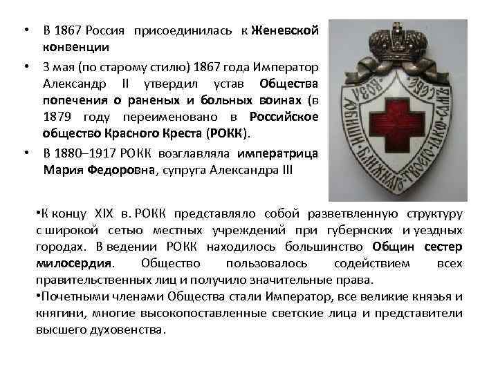 • В 1867 Россия присоединилась к Женевской конвенции • 3 мая (по старому стилю) 1867 года Император Александр II утвердил устав Общества попечения о раненых и больных воинах (в 1879 году переименовано в Российское общество Красного Креста (РОКК). • В 1880– 1917 РОКК возглавляла императрица Мария Федоровна, супруга Александра III • К концу ХIХ в. РОКК представляло собой разветвленную структуру с широкой сетью местных учреждений при губернских и уездных городах. В ведении РОКК находилось большинство Общин сестер милосердия. Общество пользовалось содействием всех правительственных лиц и получило значительные права. • Почетными членами Общества стали Император, все великие князья и княгини, многие высокопоставленные светские лица и представители высшего духовенства.