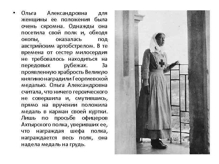• Ольга Александровна для женщины ее положения была очень скромна. Однажды она посетила свой полк и, обходя окопы, оказалась под австрийским артобстрелом. В те времена от сестер милосердия не требовалось находиться на передовых рубежах. За проявленную храбрость Великую княгиню наградили Георгиевской медалью. Ольга Александровна считала, что ничего героического не совершила и, смутившись, прямо на вручении положила медаль в карман своей куртки. Лишь по просьбе офицеров Ахтырского полка, уверивших ее, что награждая шефа полка, награждается весь полк, она надела медаль на грудь.