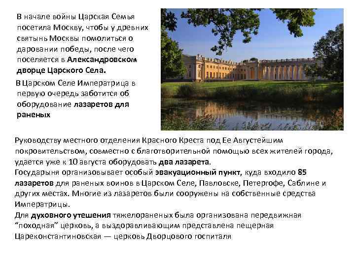 В начале войны Царская Семья посетила Москву, чтобы у древних святынь Москвы помолиться о даровании победы, после чего поселяется в Александровском дворце Царского Села. В Царском Селе Императрица в первую очередь заботится об оборудование лазаретов для раненых Руководству местного отделения Красного Креста под Ее Августейшим покровительством, совместно с благотворительной помощью всех жителей города, удается уже к 10 августа оборудовать два лазарета. Государыня организовывает особый эвакуационный пункт, куда входило 85 лазаретов для раненых воинов в Царском Селе, Павловске, Петергофе, Саблине и других местах. Многие из лазаретов были сооружены на собственные средства Императрицы. Для духовного утешения тяжелораненых была организована передвижная “походная” церковь, а выздоравливающим представлена пещерная Цареконстантиновская — церковь Дворцового госпиталя