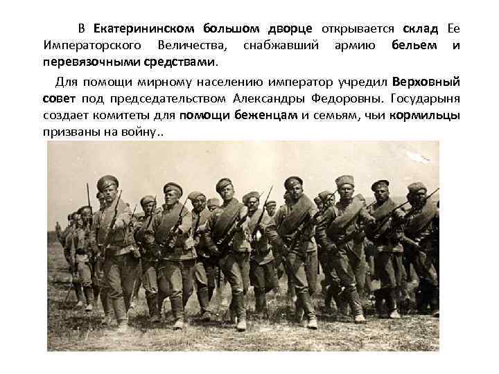 В Екатерининском большом дворце открывается склад Ее Императорского Величества, снабжавший армию бельем и перевязочными средствами. Для помощи мирному населению император учредил Верховный совет под председательством Александры Федоровны. Государыня создает комитеты для помощи беженцам и семьям, чьи кормильцы призваны на войну. .