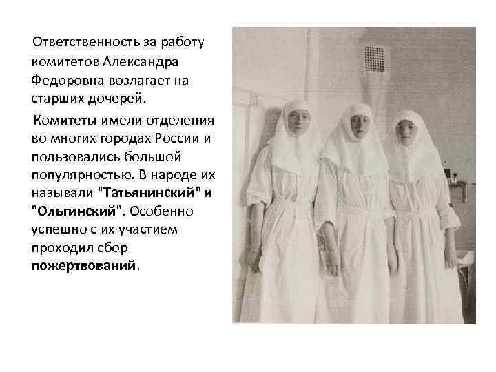 Ответственность за работу комитетов Александра Федоровна возлагает на старших дочерей. Комитеты имели отделения во многих городах России и пользовались большой популярностью. В народе их называли "Татьянинский" и "Ольгинский". Особенно успешно с их участием проходил сбор пожертвований.