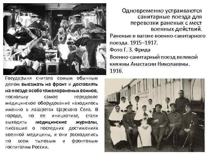 Одновременно устраиваются санитарные поезда для перевозки раненых с мест военных действий. Раненые в вагоне военно-санитарного поезда. 1915– 1917. Фото Г. З. Фрида Военно-санитарный поезд великой княжны Анастасии Николаевны. 1916. Государыня считала самым обычным делом выезжать на фронт и доставлять на поезде особо тяжелораненых воинов, поскольку самое передовое медицинское оборудование находилось именно в лазаретах Царского Села. В городе, по ее инициативе, стали выходить медицинские журналы, писавшие о последних достижениях военной медицины, и они расходились по всем тыловым и фронтовым госпиталям России.