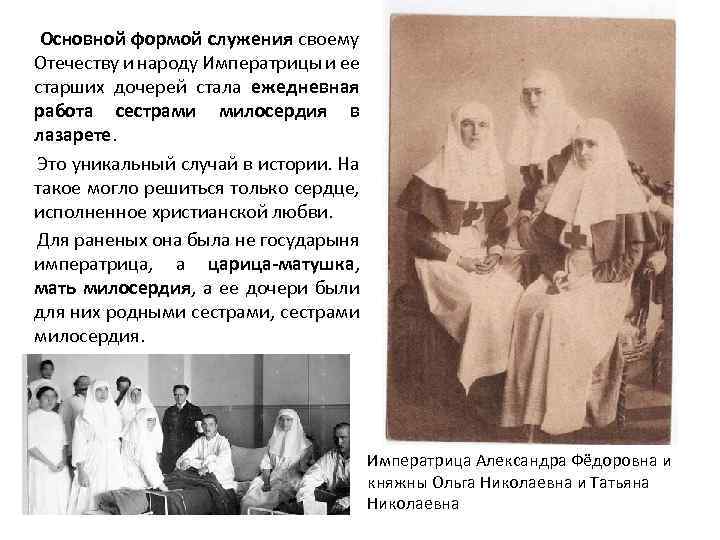 Основной формой служения своему Отечеству и народу Императрицы и ее старших дочерей стала ежедневная работа сестрами милосердия в лазарете. Это уникальный случай в истории. На такое могло решиться только сердце, исполненное христианской любви. Для раненых она была не государыня императрица, а царица-матушка, мать милосердия, а ее дочери были для них родными сестрами, сестрами милосердия. Императрица Александра Фёдоровна и княжны Ольга Николаевна и Татьяна Николаевна