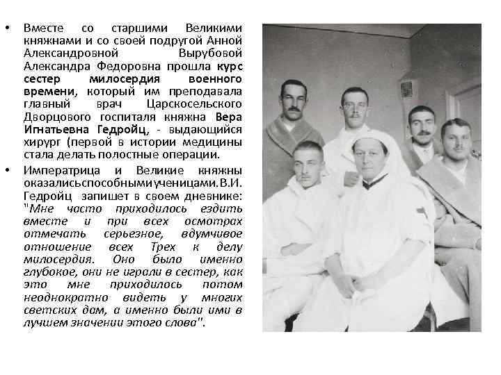 • • Вместе со старшими Великими княжнами и со своей подругой Анной Александровной Вырубовой Александра Федоровна прошла курс сестер милосердия военного времени, который им преподавала главный врач Царскосельского Дворцового госпиталя княжна Вера Игнатьевна Гедройц, - выдающийся хирург (первой в истории медицины стала делать полостные операции. Императрица и Великие княжны оказались способными ученицами. В. И. Гедройц запишет в своем дневнике: "Мне часто приходилось ездить вместе и при всех осмотрах отмечать серьезное, вдумчивое отношение всех Трех к делу милосердия. Оно было именно глубокое, они не играли в сестер, как это мне приходилось потом неоднократно видеть у многих светских дам, а именно были ими в лучшем значении этого слова".