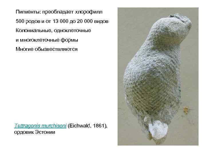 Пигменты: преобладает хлорофилл 500 родов и от 13 000 до 20 000 видов Колониальные, одноклеточные и многоклеточные формы Многие обызвествляются Tettragonis murchisoni (Eichwald, 1861), ордовик Эстонии