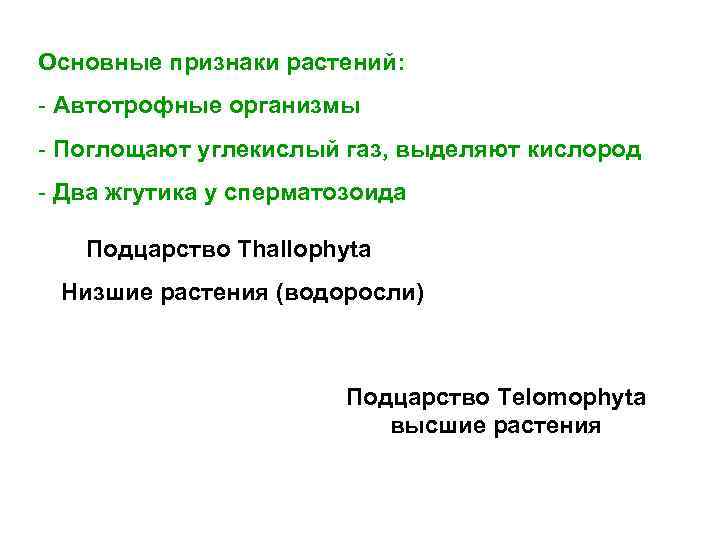Основные признаки растений: - Автотрофные организмы - Поглощают углекислый газ, выделяют кислород - Два жгутика у сперматозоида Подцарство Thallophyta Низшие растения (водоросли) Подцарство Telomophyta высшие растения