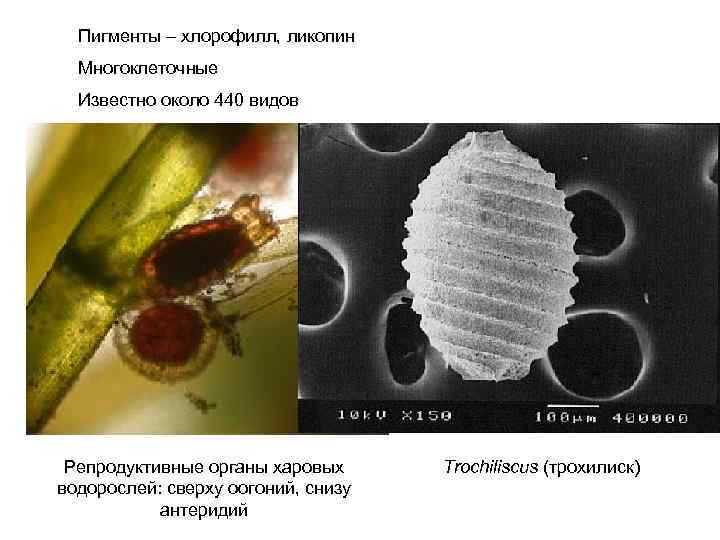 Пигменты – хлорофилл, ликопин Многоклеточные Известно около 440 видов Репродуктивные органы харовых водорослей: сверху оогоний, снизу антеридий Trochiliscus (трохилиск)