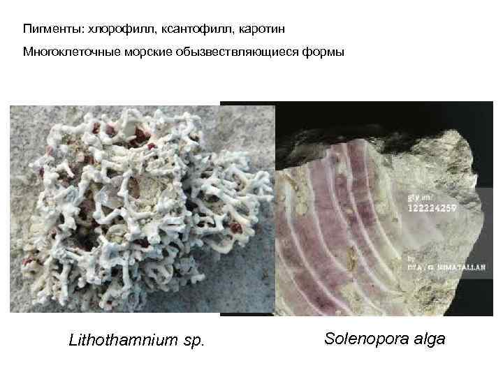 Пигменты: хлорофилл, ксантофилл, каротин Многоклеточные морские обызвествляющиеся формы Lithothamnium sp. Solenopora alga