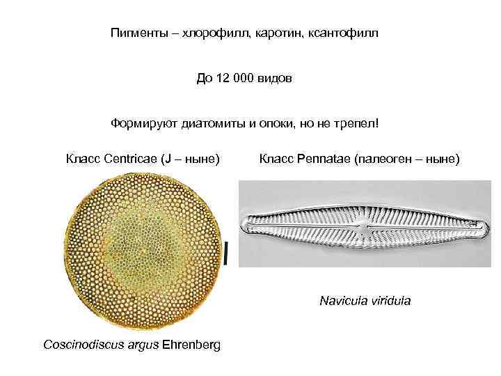 Пигменты – хлорофилл, каротин, ксантофилл До 12 000 видов Формируют диатомиты и опоки, но не трепел! Класс Centricae (J – ныне) Класс Pennatae (палеоген – ныне) Navicula viridula Coscinodiscus argus Ehrenberg
