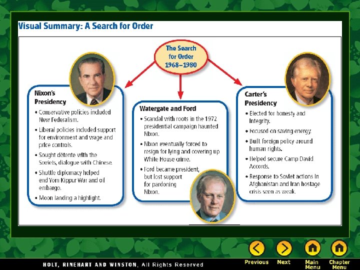 Carter’s Presidency The Main Idea Jimmy Carter used his reputation for honesty to win the presidency in 1976, but he soon met challenges that required other qualities as well. Reading Focus • What were some of the difficult domestic challenges facing Carter and the nation in the late 1970 s? • What were Carter’s greatest foreign-policy triumphs and challenges? • How did international crises affect Carter’s presidency?