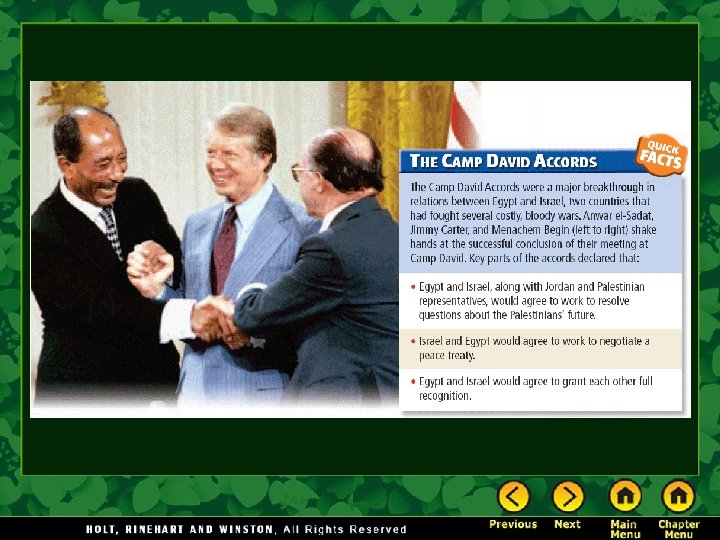 Carter’s Foreign Policy Panama Canal • American control of the Panama Canal had been a source of conflict between the two countries. • In 1977 Carter and Panama’s leader agreed that the US would control the canal until 1999 • For some Americans, loss of control of the canal represented a decline in American power. Camp David Accords • Greatest foreign-policy achievement • Conflict between Egypt and Israel continued. Egypt would not recognize Israel and Israel continued to occupy Egyptian territory. • Carter guided Anwar el. Sadat and Menachem Begin to a historic agreement that came to be called the Camp David Accords. • Begin and Sadat won the Nobel Peace Prize in 1979.