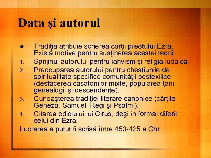Data şi autorul Tradiţia atribuie scrierea cărţii preotului Ezra. Există motive pentru susţinerea acestei teorii: 1. Sprijinul autorului pentru iahvism şi religia iudaică. 2. Preocuparea autorului pentru chestiunile de spiritualitate specifice comunităţii postexilice (desfacerea căsătoriilor mixte, popularea ţării, genealogii şi descendenţe). 3. Cunoaşterea tradiţiei literare canonice (cărţile Geneza, Samuel, Regi şi Psalmi). 4. Citarea edictului Cirus, deşi în format diferit celui din Ezra. Lucrarea a putut fi scrisă între 450 -425 a. Chr. l