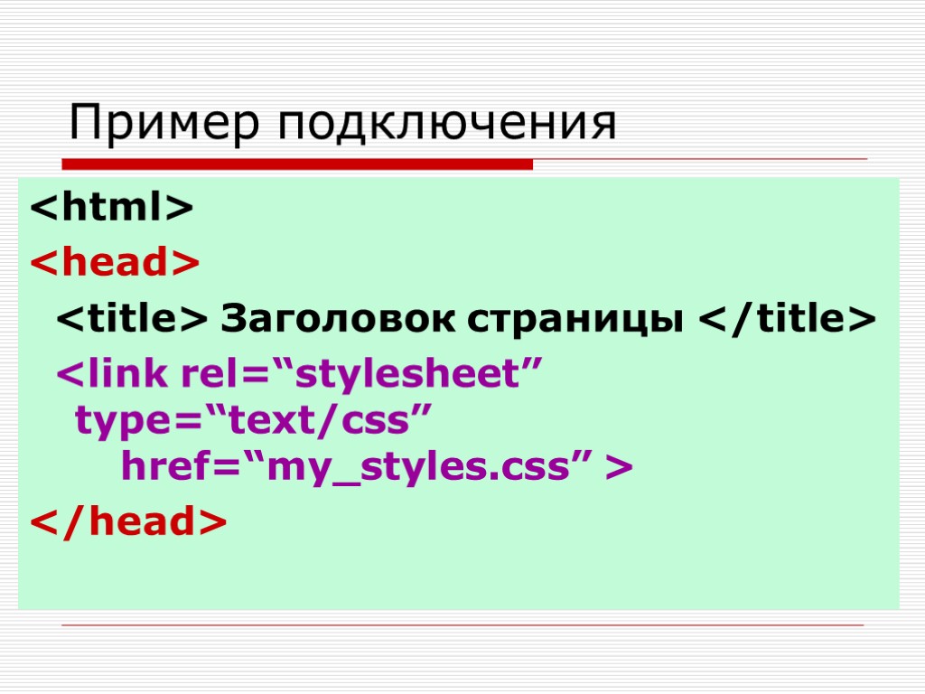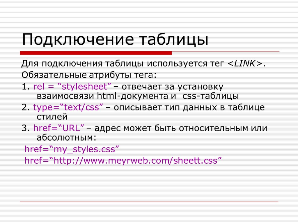 Подключение таблицы Для подключения таблицы используется тег . Обязательные атрибуты тега: 1. rel = “stylesheet” – отвечает за установку взаимосвязи html-документа и css-таблицы 2. type=“text/css” – описывает тип данных в таблице стилей 3. href=“URL” – адрес может быть относительным или абсолютным: href=“my_styles.css” href=“http://www.meyrweb.com/sheett.css”
