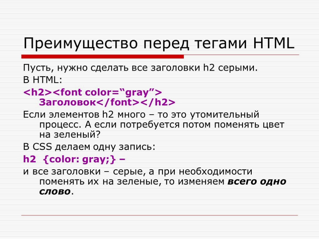 Если элементов h2 много – то это утомительный процесс. А если потребуется потом поменять цвет на зеленый? В CSS делаем одну запись: h2 {color: gray;} – и все заголовки – серые, а при необходимости поменять их на зеленые, то изменяем всего одно слово.