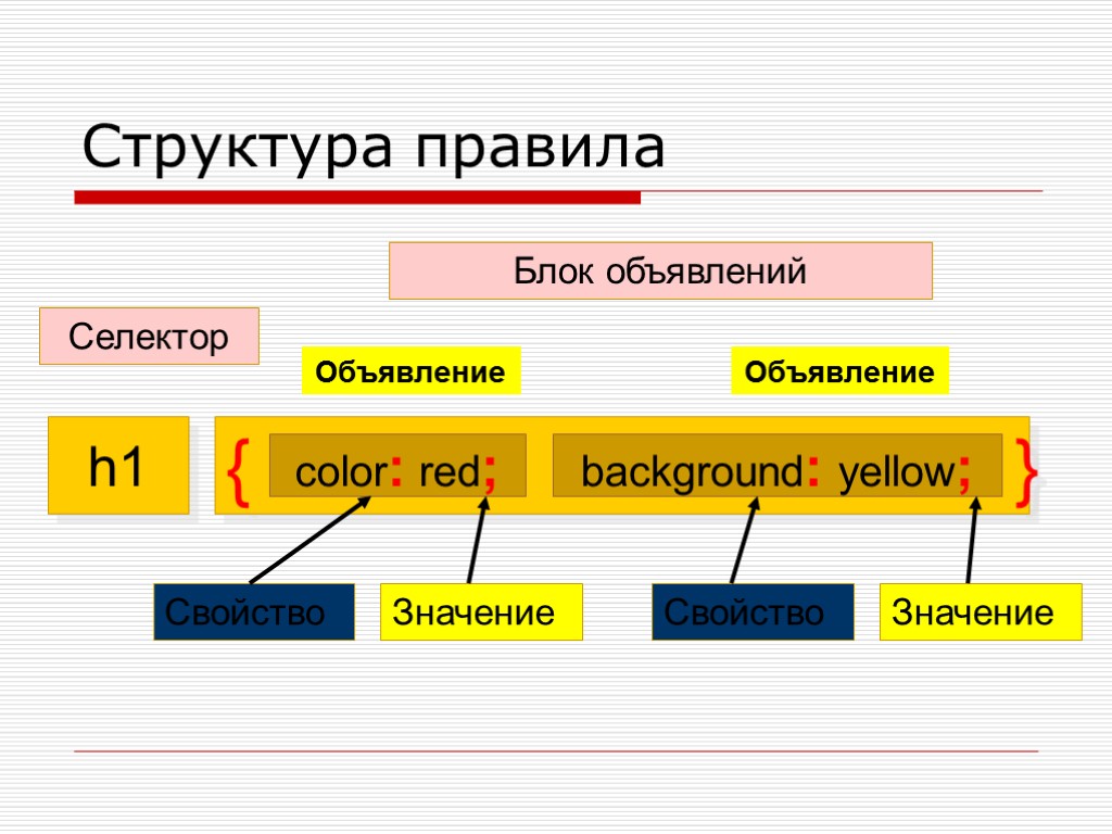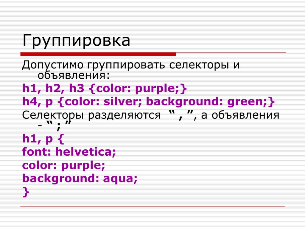 Группировка Допустимо группировать селекторы и объявления: h1, h2, h3 {color: purple;} h4, p {color: silver; background: green;} Селекторы разделяются “ , ”, а объявления - “ ; ” h1, p { font: helvetica; color: purple; background: aqua; }