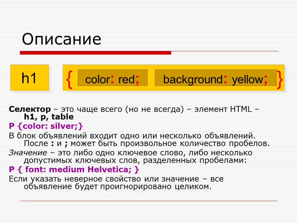 Описание Селектор – это чаще всего (но не всегда) – элемент HTML – h1, p, table P {color: silver;} В блок объявлений входит одно или несколько объявлений. После : и ; может быть произвольное количество пробелов. Значение – это либо одно ключевое слово, либо несколько допустимых ключевых слов, разделенных пробелами: P { font: medium Helvetica; } Если указать неверное свойство или значение – все объявление будет проигнорировано целиком.