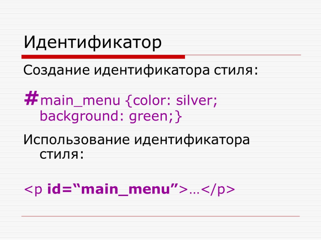 Идентификатор Создание идентификатора стиля: #main_menu {color: silver; background: green;} Использование идентификатора стиля: