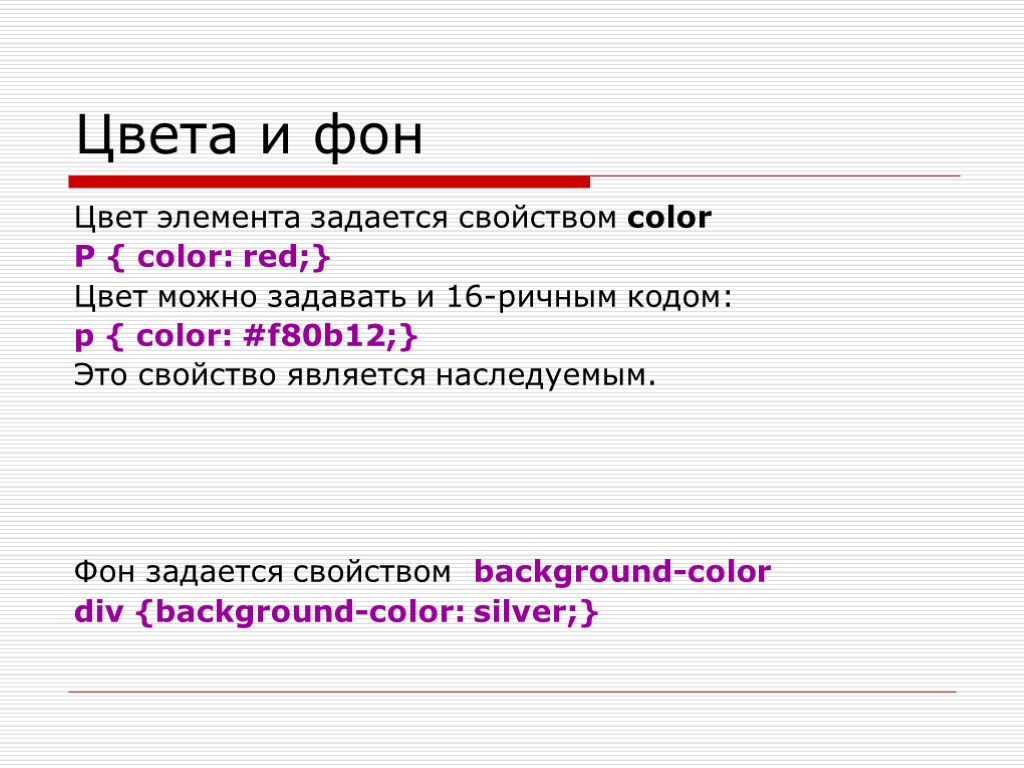 Цвета и фон Цвет элемента задается свойством color P { color: red;} Цвет можно задавать и 16-ричным кодом: p { color: #f80b12;} Это свойство является наследуемым. Фон задается свойством background-color div {background-color: silver;}