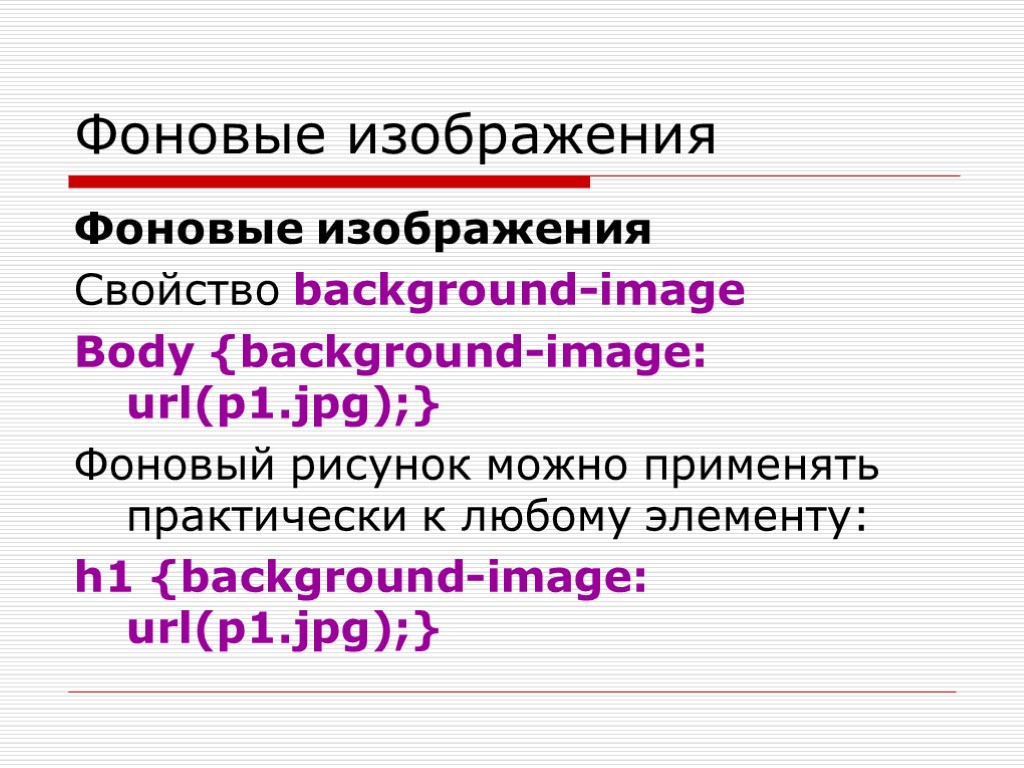 Фоновые изображения Фоновые изображения Свойство background-image Body {background-image: url(p1.jpg);} Фоновый рисунок можно применять практически к любому элементу: h1 {background-image: url(p1.jpg);}