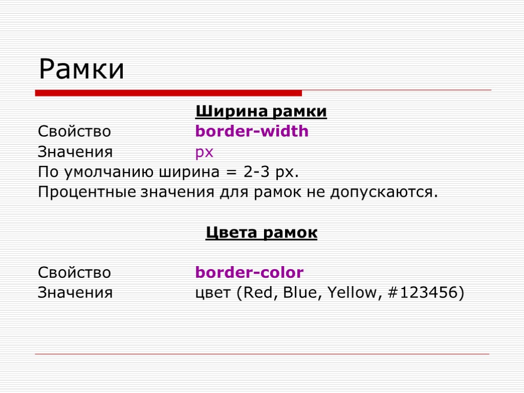 Рамки Ширина рамки Свойство border-width Значения px По умолчанию ширина = 2-3 px. Процентные значения для рамок не допускаются. Цвета рамок Свойство border-color Значения цвет (Red, Blue, Yellow, #123456)