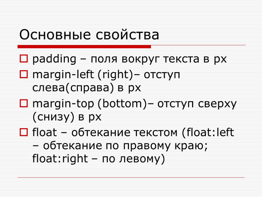 Основные свойства padding – поля вокруг текста в px margin-left (right)– отступ слева(справа) в px margin-top (bottom)– отступ сверху (снизу) в px float – обтекание текстом (float:left – обтекание по правому краю; float:right – по левому)