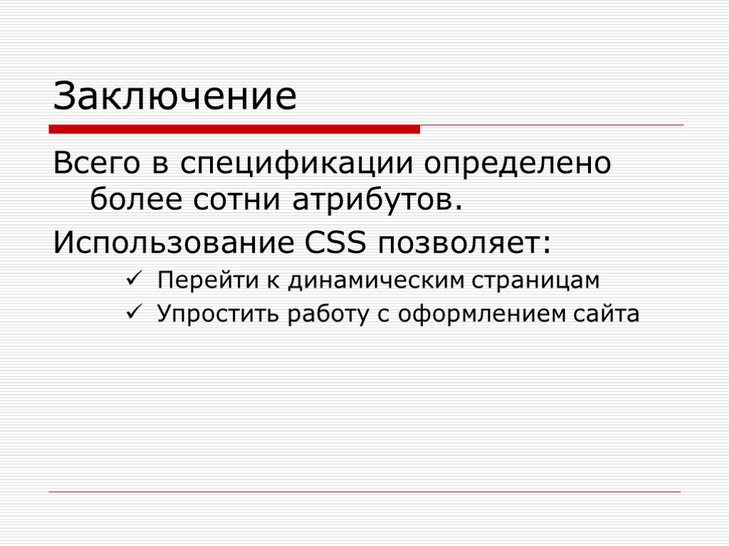 Заключение Всего в спецификации определено более сотни атрибутов. Использование CSS позволяет: Перейти к динамическим страницам Упростить работу с оформлением сайта