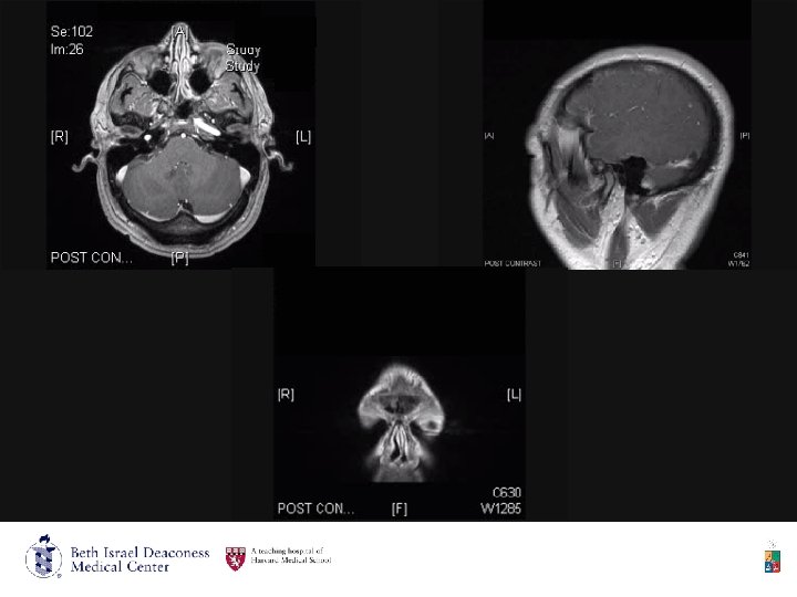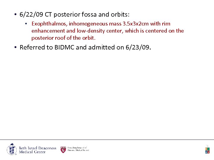 • 6/22/09 CT posterior fossa and orbits: • Exophthalmos, inhomogeneous mass 3. 5 x 3 x 2 cm with rim enhancement and low-density center, which is centered on the posterior roof of the orbit. • Referred to BIDMC and admitted on 6/23/09.