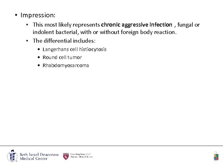 • Impression: • This most likely represents chronic aggressive infection , fungal or indolent bacterial, with or without foreign body reaction. • The differential includes: • Langerhans cell histiocytosis • Round cell tumor • Rhabdomyosarcoma