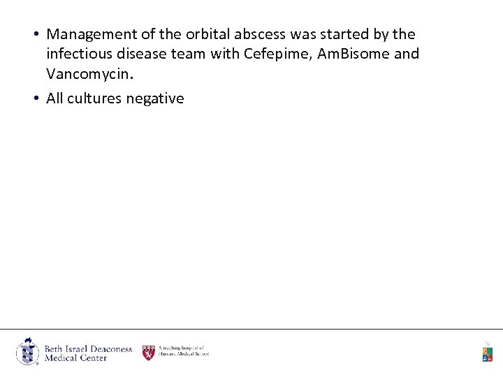 • Management of the orbital abscess was started by the infectious disease team with Cefepime, Am. Bisome and Vancomycin. • All cultures negative