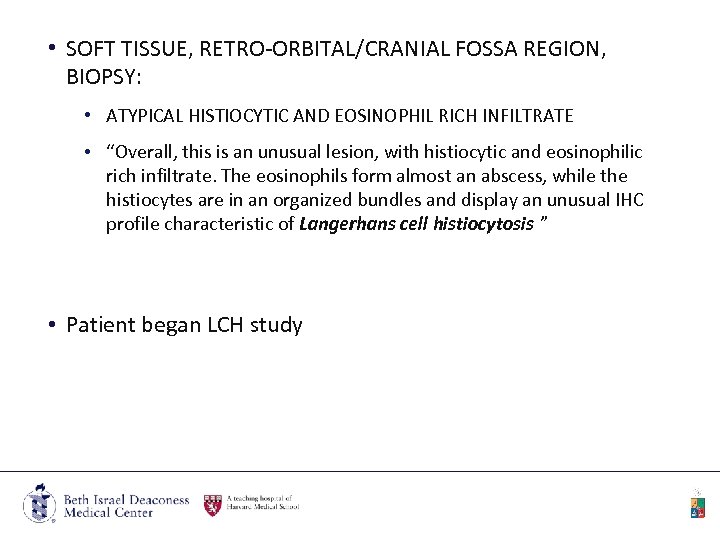• SOFT TISSUE, RETRO-ORBITAL/CRANIAL FOSSA REGION, BIOPSY: • ATYPICAL HISTIOCYTIC AND EOSINOPHIL RICH INFILTRATE • “Overall, this is an unusual lesion, with histiocytic and eosinophilic rich infiltrate. The eosinophils form almost an abscess, while the histiocytes are in an organized bundles and display an unusual IHC profile characteristic of Langerhans cell histiocytosis ” • Patient began LCH study