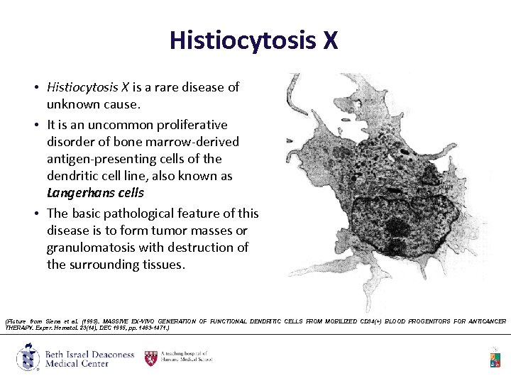 Histiocytosis X • Histiocytosis X is a rare disease of unknown cause. • It is an uncommon proliferative disorder of bone marrow-derived antigen-presenting cells of the dendritic cell line, also known as Langerhans cells • The basic pathological feature of this disease is to form tumor masses or granulomatosis with destruction of the surrounding tissues. (Picture from Siena et al. (1995). MASSIVE EX-VIVO GENERATION OF FUNCTIONAL DENDRITIC CELLS FROM MOBILIZED CD 34(+) BLOOD PROGENITORS FOR ANTICANCER THERAPY. Exper. Hematol. 23(14), DEC 1995, pp. 1463 -1471. )