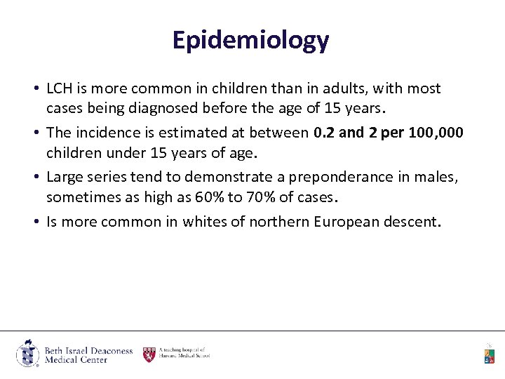 Epidemiology • LCH is more common in children than in adults, with most cases being diagnosed before the age of 15 years. • The incidence is estimated at between 0. 2 and 2 per 100, 000 children under 15 years of age. • Large series tend to demonstrate a preponderance in males, sometimes as high as 60% to 70% of cases. • Is more common in whites of northern European descent.