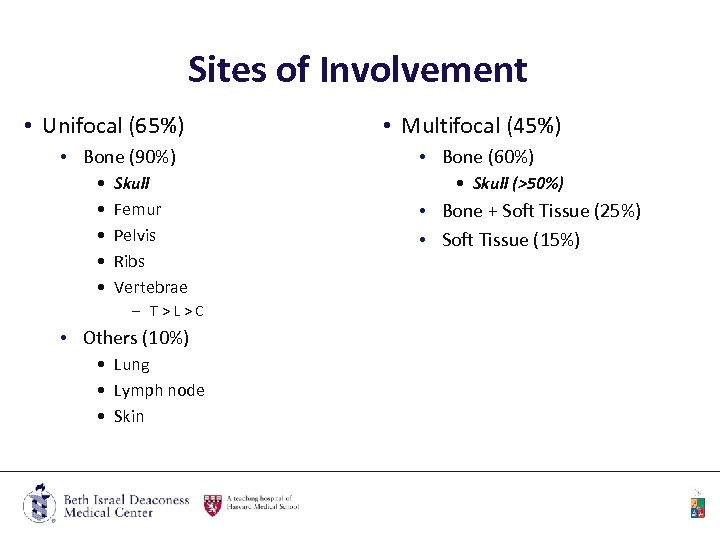 Sites of Involvement • Unifocal (65%) • Bone (90%) • • • Skull Femur Pelvis Ribs Vertebrae – T > L > C • Others (10%) • Lung • Lymph node • Skin • Multifocal (45%) • Bone (60%) • Skull (>50%) • Bone + Soft Tissue (25%) • Soft Tissue (15%)