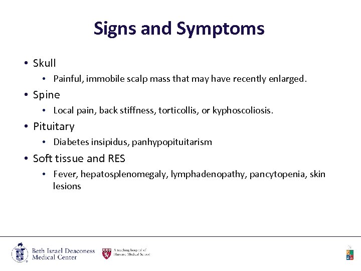 Signs and Symptoms • Skull • Painful, immobile scalp mass that may have recently enlarged. • Spine • Local pain, back stiffness, torticollis, or kyphoscoliosis. • Pituitary • Diabetes insipidus, panhypopituitarism • Soft tissue and RES • Fever, hepatosplenomegaly, lymphadenopathy, pancytopenia, skin lesions