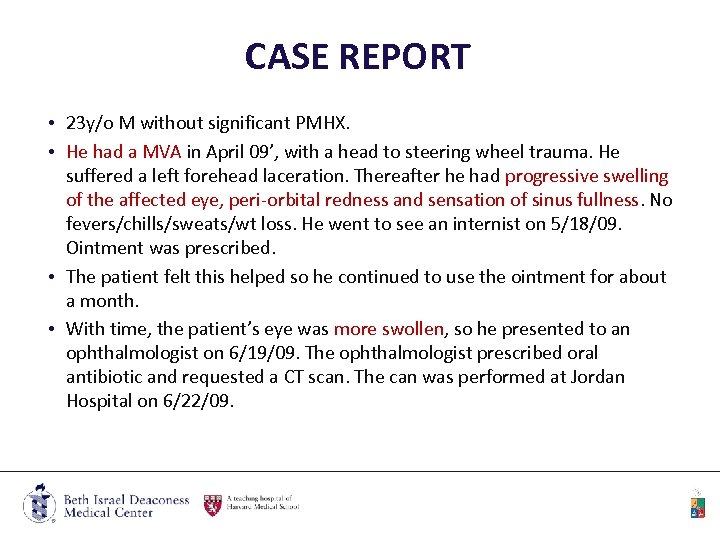 CASE REPORT • 23 y/o M without significant PMHX. • He had a MVA in April 09’, with a head to steering wheel trauma. He suffered a left forehead laceration. Thereafter he had progressive swelling of the affected eye, peri-orbital redness and sensation of sinus fullness. No fevers/chills/sweats/wt loss. He went to see an internist on 5/18/09. Ointment was prescribed. • The patient felt this helped so he continued to use the ointment for about a month. • With time, the patient’s eye was more swollen, so he presented to an ophthalmologist on 6/19/09. The ophthalmologist prescribed oral antibiotic and requested a CT scan. The can was performed at Jordan Hospital on 6/22/09.
