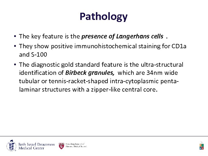 Pathology • The key feature is the presence of Langerhans cells. • They show positive immunohistochemical staining for CD 1 a and S-100 • The diagnostic gold standard feature is the ultra-structural identification of Birbeck granules, which are 34 nm wide tubular or tennis-racket-shaped intra-cytoplasmic pentalaminar structures with a zipper-like central core.