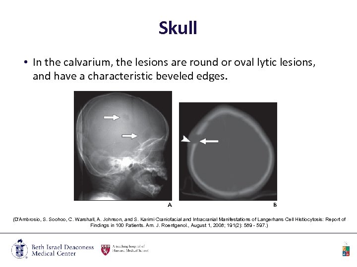 Skull • In the calvarium, the lesions are round or oval lytic lesions, and have a characteristic beveled edges. (D'Ambrosio, S. Soohoo, C. Warshall, A. Johnson, and S. Karimi Craniofacial and Intracranial Manifestations of Langerhans Cell Histiocytosis: Report of Findings in 100 Patients. Am. J. Roentgenol. , August 1, 2008; 191(2): 589 - 597. )