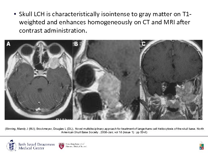 • Skull LCH is characteristically isointense to gray matter on T 1 weighted and enhances homogeneously on CT and MRI after contrast administration. (Binning, Mandy J (MJ); Brockmeyer, Douglas L (DL); . Novel multidisciplinary approach for treatment of langerhans cell histiocytosis of the skull base. North American Skull Base Society. 2008 -Jan; vol 18 (issue 1) : pp 53 -8)