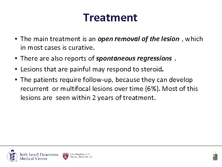 Treatment • The main treatment is an open removal of the lesion , which in most cases is curative. • There also reports of spontaneous regressions. • Lesions that are painful may respond to steroid. • The patients require follow-up, because they can develop recurrent or multifocal lesions over time (6%). Most of this lesions are seen within 2 years of treatment.