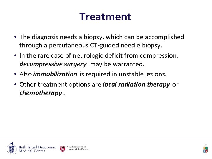 Treatment • The diagnosis needs a biopsy, which can be accomplished through a percutaneous CT-guided needle biopsy. • In the rare case of neurologic deficit from compression, decompressive surgery may be warranted. • Also immobilization is required in unstable lesions. • Other treatment options are local radiation therapy or chemotherapy.