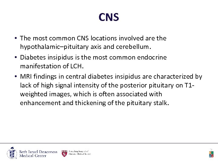 CNS • The most common CNS locations involved are the hypothalamic–pituitary axis and cerebellum. • Diabetes insipidus is the most common endocrine manifestation of LCH. • MRI findings in central diabetes insipidus are characterized by lack of high signal intensity of the posterior pituitary on T 1 weighted images, which is often associated with enhancement and thickening of the pituitary stalk.