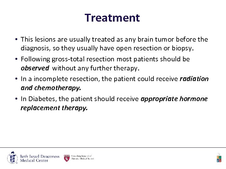 Treatment • This lesions are usually treated as any brain tumor before the diagnosis, so they usually have open resection or biopsy. • Following gross-total resection most patients should be observed without any furtherapy. • In a incomplete resection, the patient could receive radiation and chemotherapy. • In Diabetes, the patient should receive appropriate hormone replacement therapy.